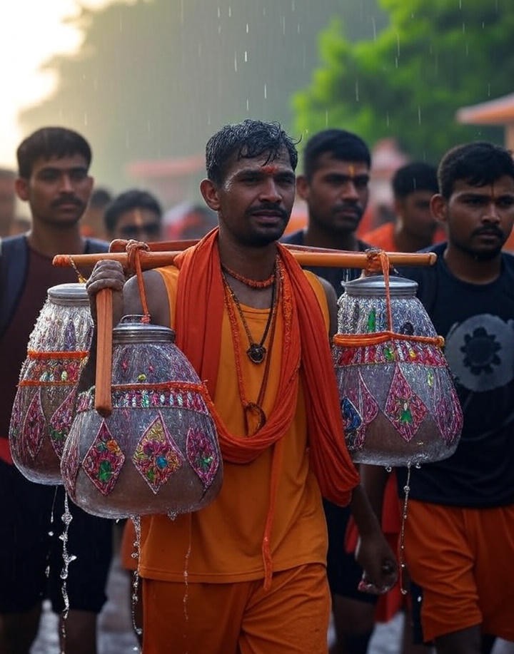 Essentials include a Kanwar (bamboo pole with pitchers), saffron clothing, reusable water bottles, first-aid supplies, and personal hygiene items. Avoid non-vegetarian food and alcohol.